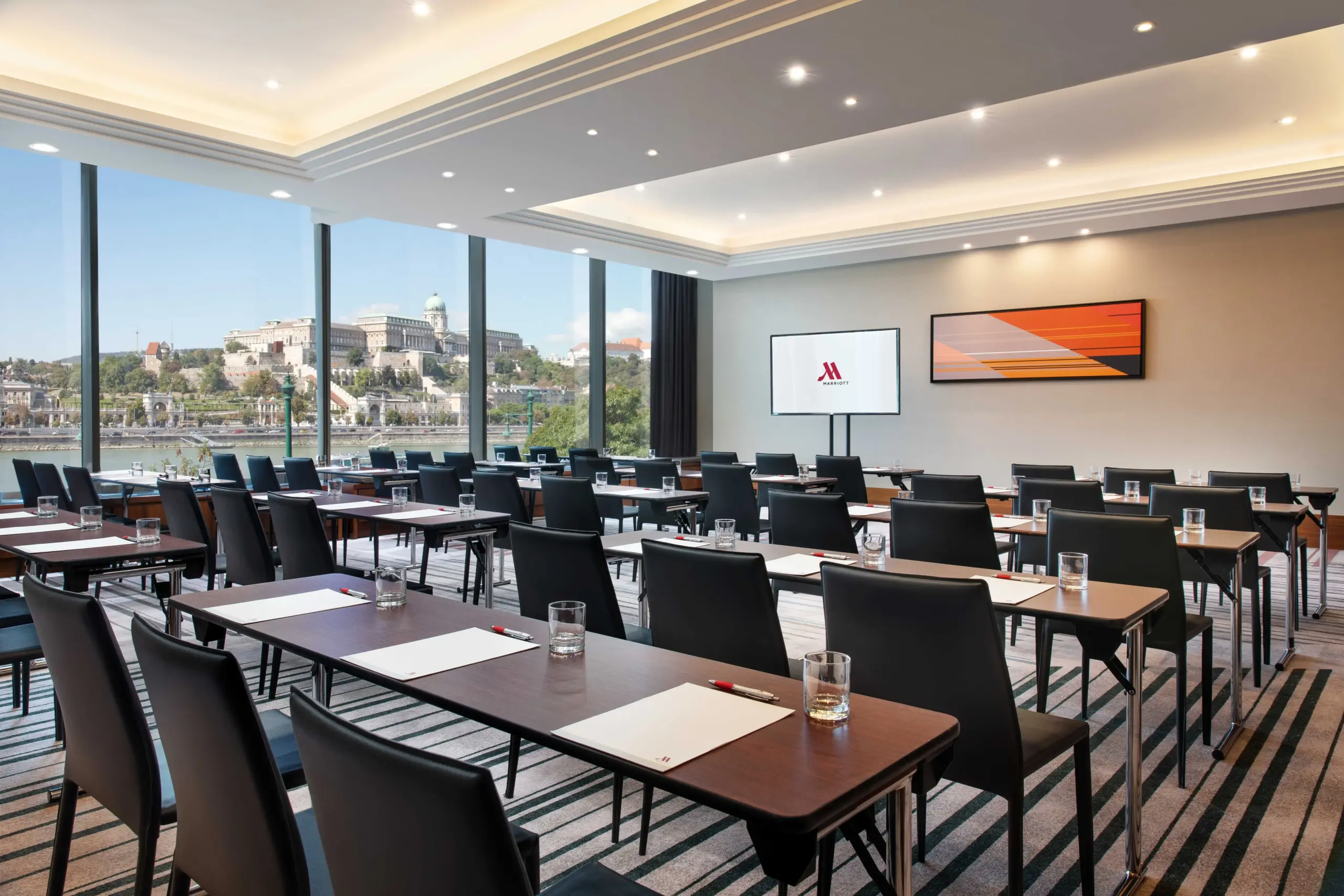 Konferenciaterem classroom elrendezésben Budai Vár panorámával