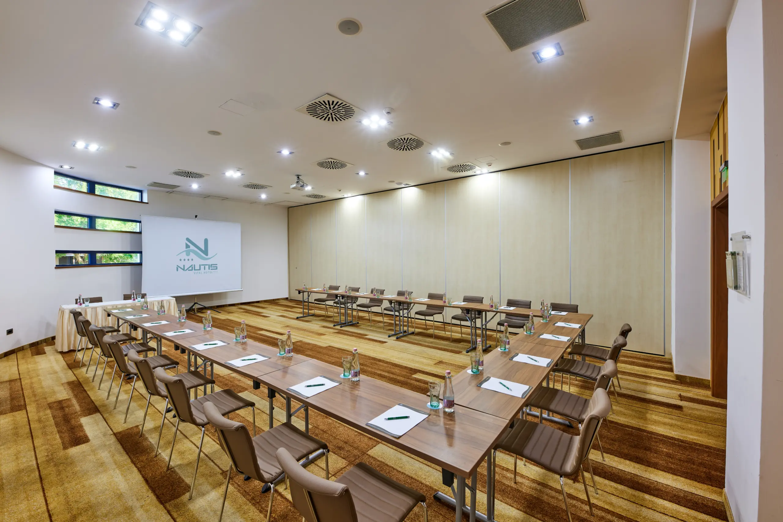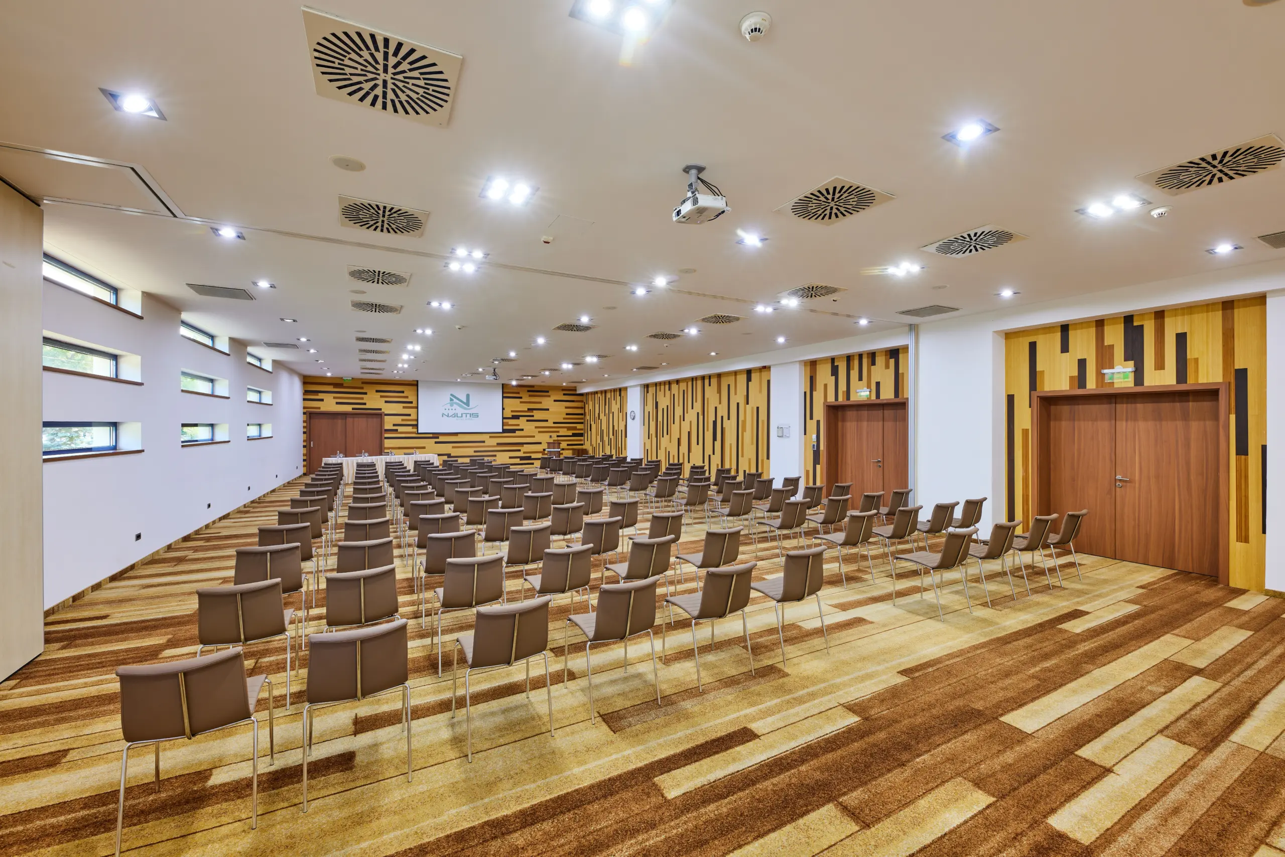 Nagyszabású konferenciákhoz: A Nautis terem 250 fős széksorozattal és hangszigetelt mobilfalával ideális plenáris előadásokhoz, amely 1/3 – 2/3 arányban szekcionálható párhuzamos programokhoz.